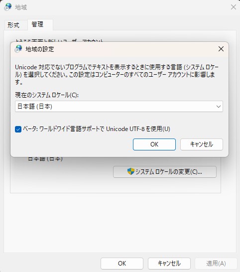 一度システムロケールをWindowsの文字コードUnicodeからUTF-8にしましたが当初気が付かなかった思わぬ症状によりwindowsのシステムロケールを元に戻しました